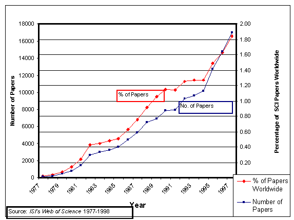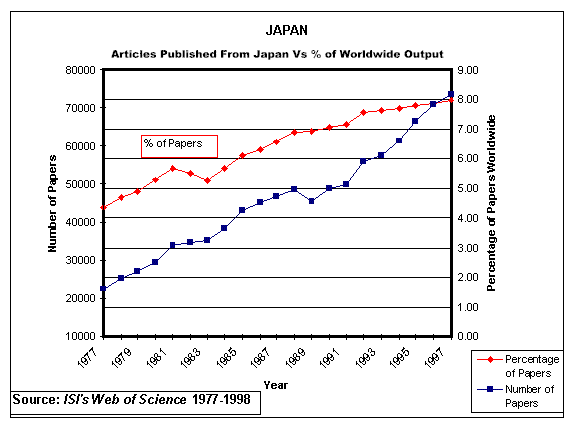shows Japan went from 22,500 papers per year to 73,500 in 1997 – more than tripling. Percentage wise, Japan went from over 4% to 8% -- doubling its fraction of worldwide output.