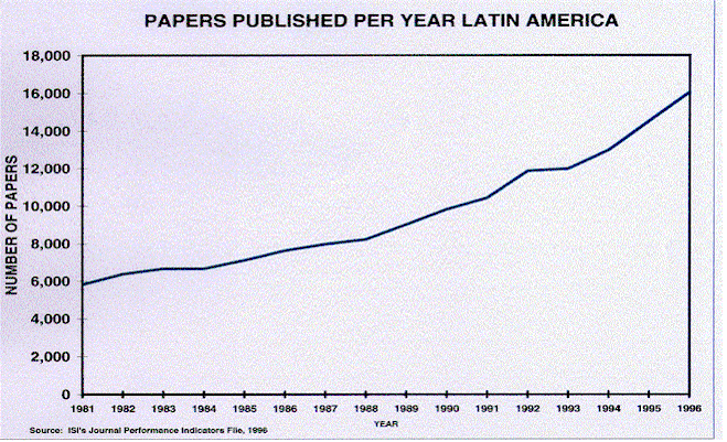Figure 15 shows the growth in Latin America. There is much said about Third World Science. Research from the developing countries is increasingly published in international and multi-national journals. As I reported recently in Current Science7 of India, the ISI database is often perceived as biased with respect to language and the western countries. But there is no statistically valid agreed upon definition of bias. In any case, Third World coverage in the SCI has increased significantly in most cases. The best material from the Third World is in fact published in the international journals.