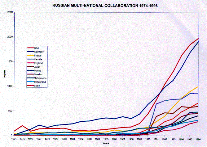As you can see, since Perestroika Russia has increased its multi-national collaborations dramatically, especially with the US and Germany.