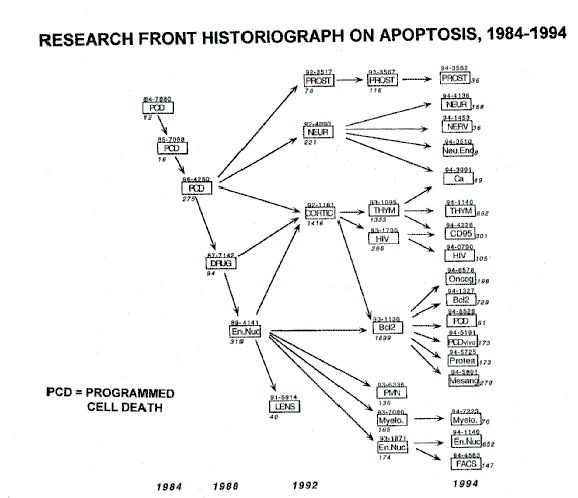 Last year Gerry Melino and I published a long-term citation analysis of the field of apoptosis in which we provided a ten-year historiograph of research fronts showing the evolution of the field.11 |