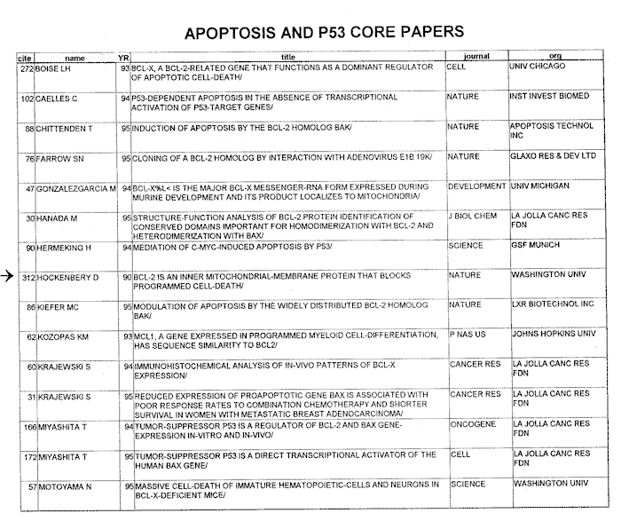In some respects, it would be cleaner to simply identify the institutions involved. For example, Hockenberry, et al, at Washington University in St. Louis, produced many of the core papers. Their 1990 paper on BCL-2 was cited 312 times in 1996 alone. A list of the core papers appears in Figure 24