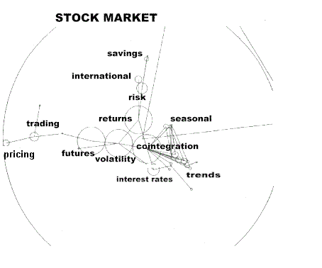 In the map in Figure 26 we see the literature relating to studies of innovation, business, investment and stocks in particular. Keep in mind that the literature of business and investing clusters are separate from the large cluster for economics.