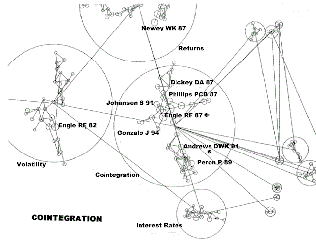 As we zoom in on cointegration we see numerous core papers as shown in Figure 30 Incidentally, the names of these research fronts are produced by an algorithmic procedure developed by our deceased colleague Irving H. Sher and involves the parsing of clusters of cited and citing article titles.